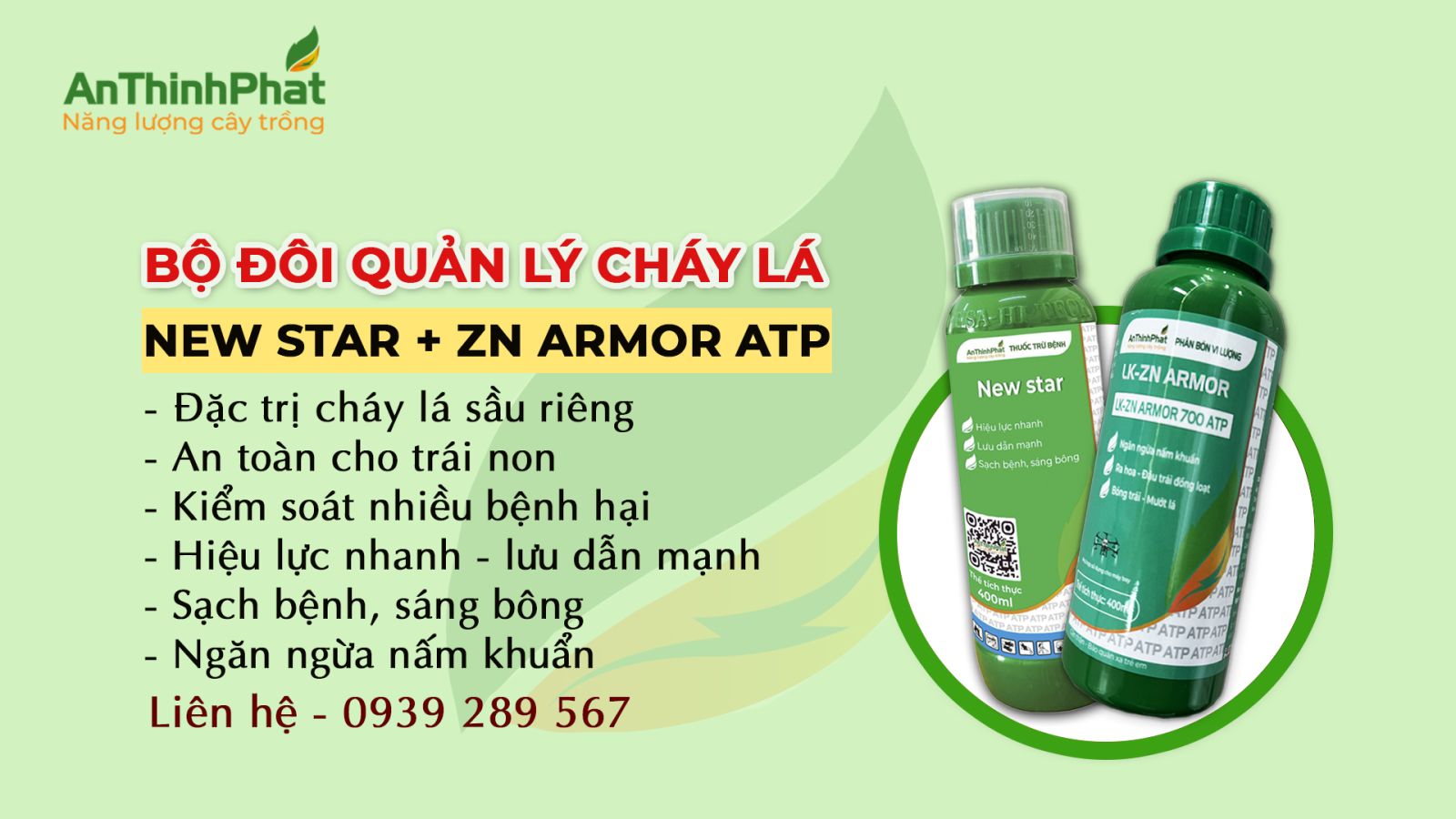 Bên cạnh đó, bộ đôi quản lý cháy lá gồm New Star + Zn Armor cũng có hiệu quả trong việc quản lý cháy lá do thán thư gây ra. Đối với bộ đôi này, nhà vườn có thể sử dụng theo liều lượng 1 chai New Star + 1 chai Zn Armor pha cho 400 lít nước, phun toàn thân cành và mặt dưới lá theo định kỳ 7 - 10 ngày/ 1 lần, phun từ 2 đến 3 lần.